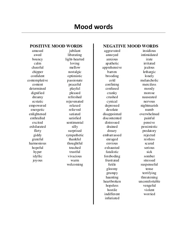 Here are a bunch of words that relate to mood. There are many more. Click to expand.